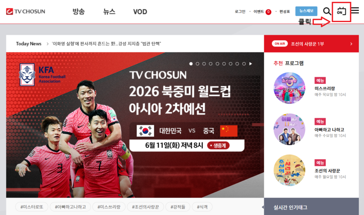 ② 홈페이지 오른쪽 상단 ON이 적힌 TV모양 클릭